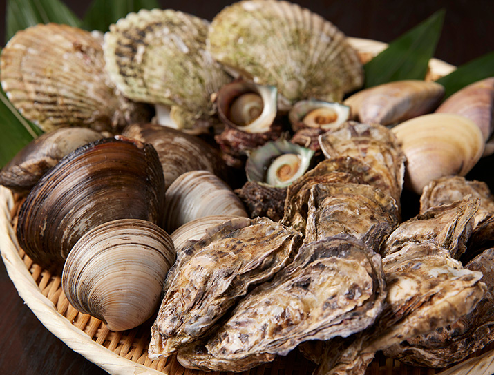 まるっぽの名物は、店名の通り“浜焼き”!日本全国から季節ごとに仕入れた国産貝を卓上のコンロで焼いてお召し上がりいただけます。サザエやはまぐり、ホタテ、牡蠣など種類は様々。店内の生け簀で管理しているので、どれも鮮度抜群です。お好きな日本酒と合わせてどうぞ。